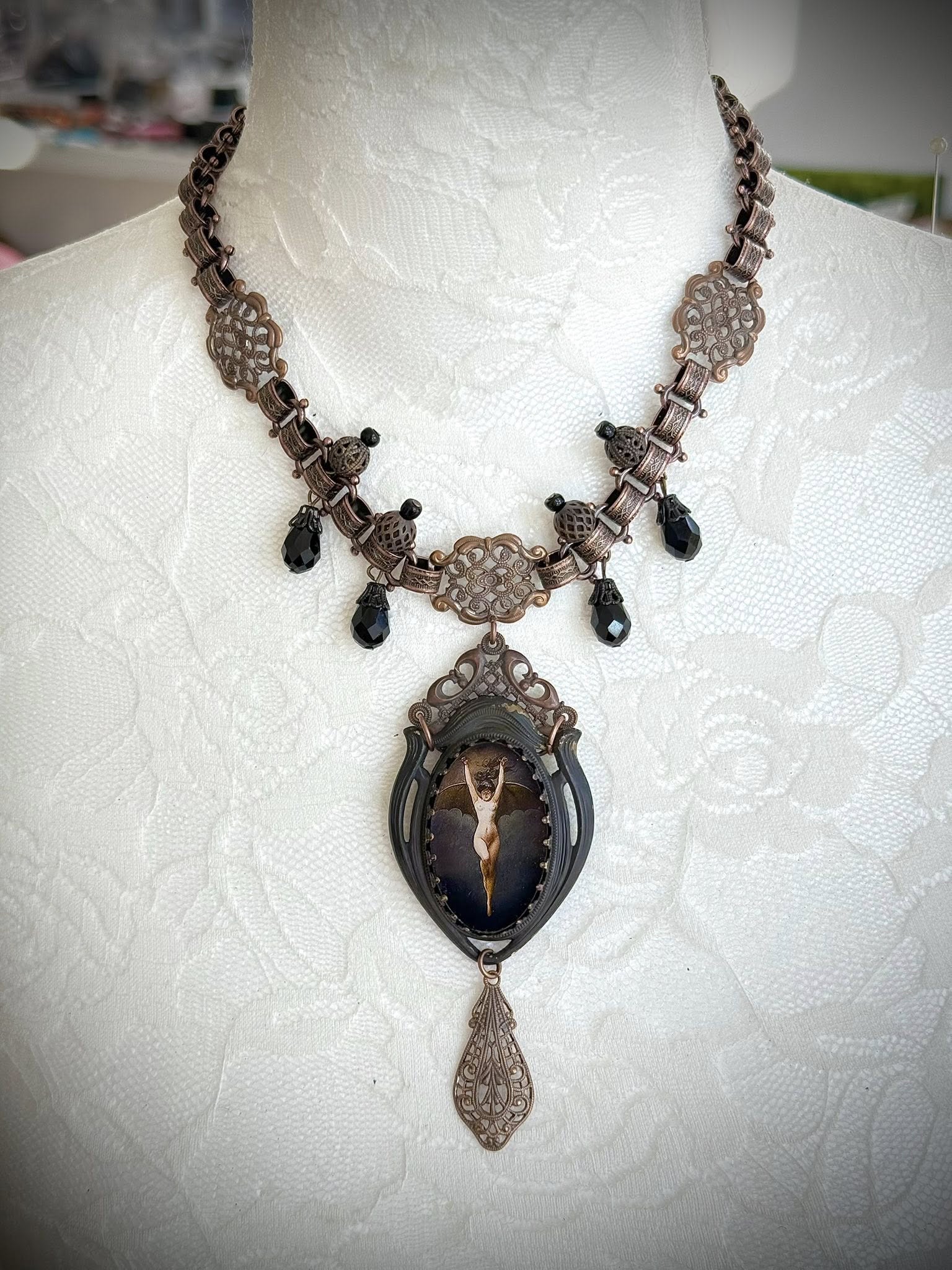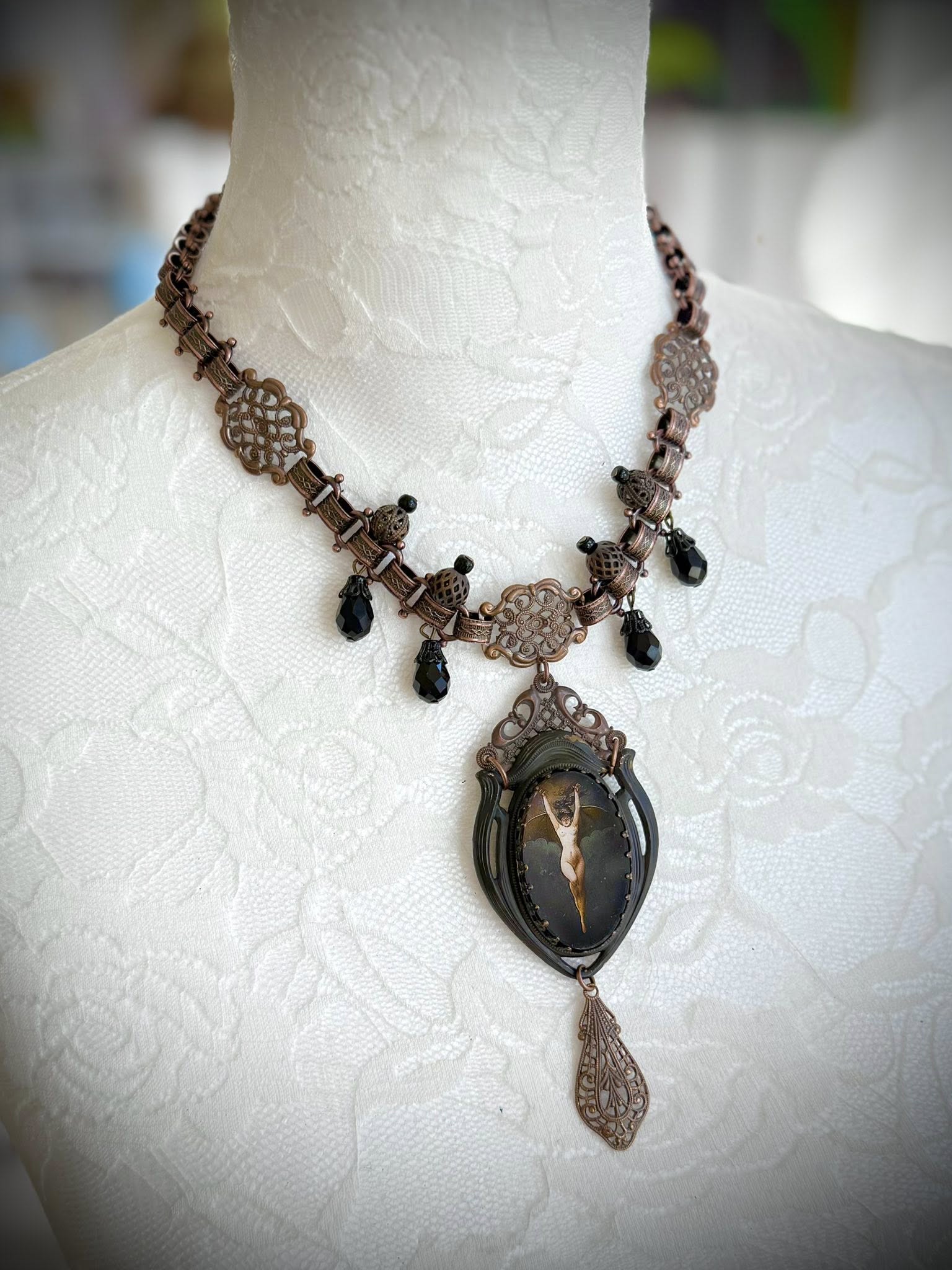 Here is a unique necklace featuring a handmade glass focal of a Bat Woman painting by Albert Joseph Penot. She is set in a crown edge bezel atop a vintage Nouveau copper frame. She hangs from German coppers filigrees, diamond and lace textured metal beads, faceted glass black teardrops, copper plated ornate book chain, and a copper plated Toggle clasp.