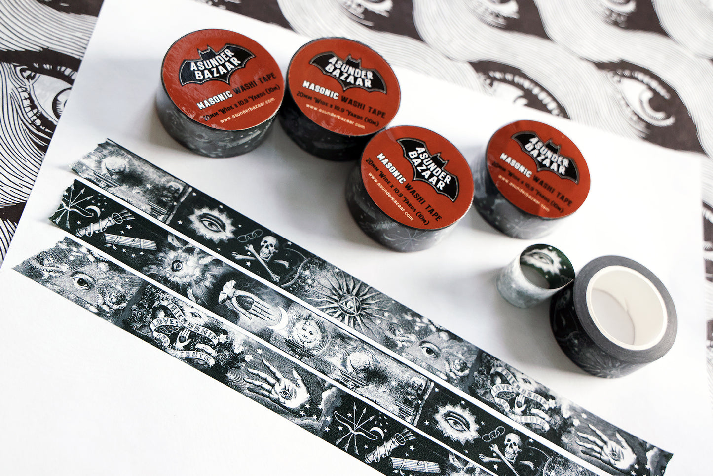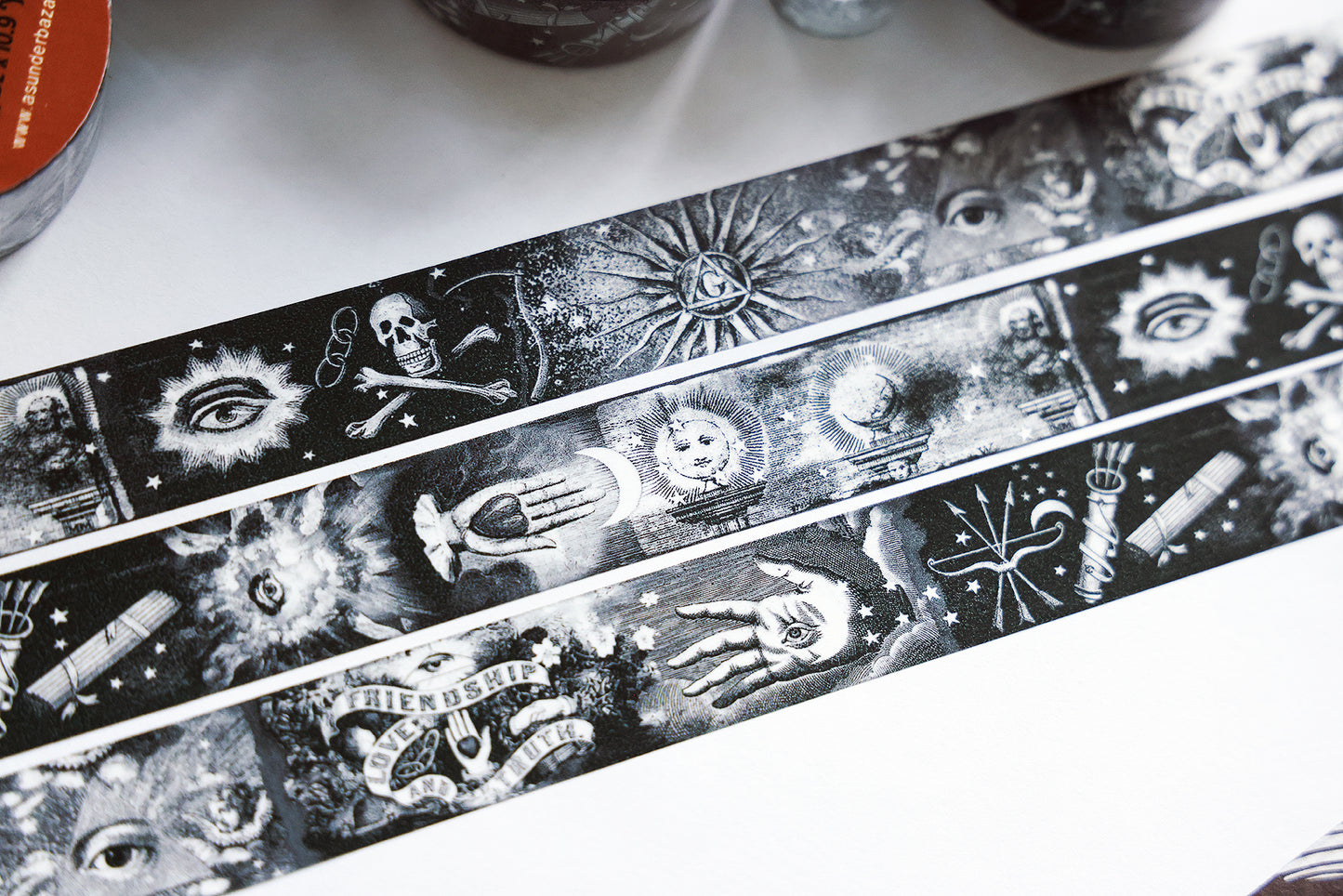 This PET Washi Tape is 20mm wide, and the length of the roll is 10.9 yards (10 meters). It features vintage Masonic Art collaged with Ephemera in Black and White.