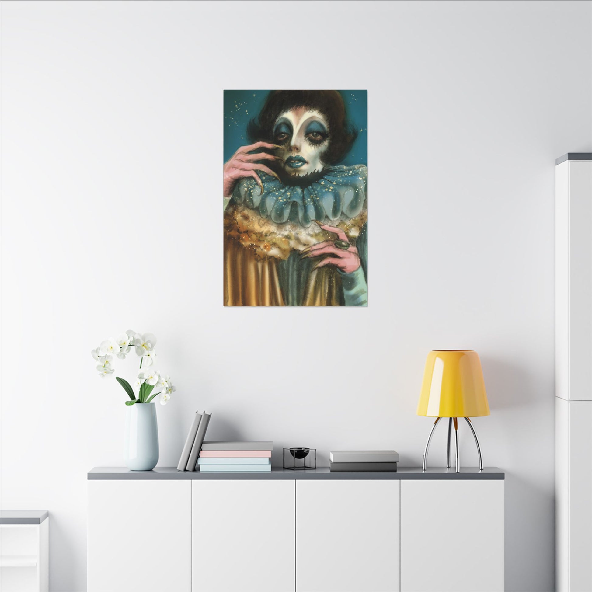 This matte canvas print features the Original Acrylic and Mica Painting "Pierrot 01" by Cristina Beller. Each matte canvas comes with back hanging already included for convenient placement. The frame is made with profile radial pine that is ethically sourced from renewable forests.