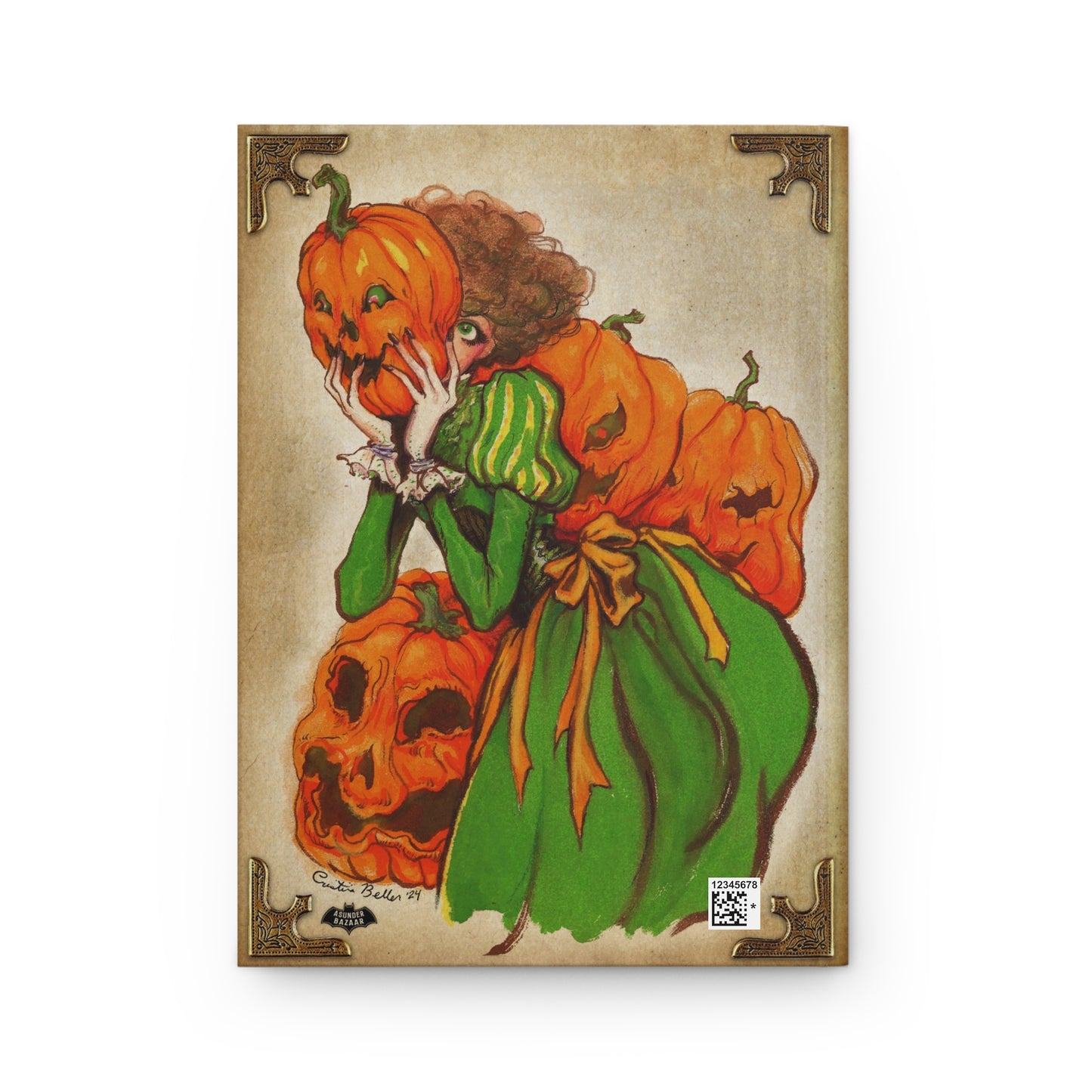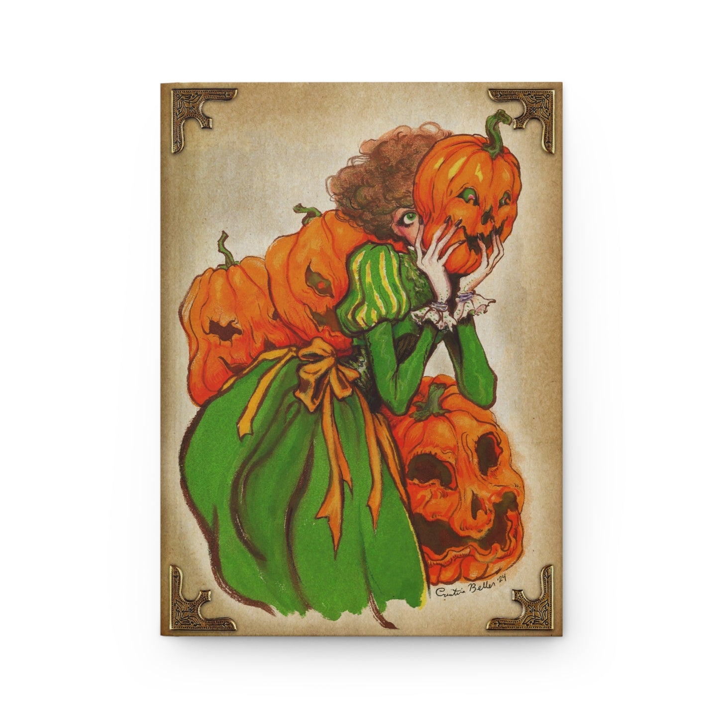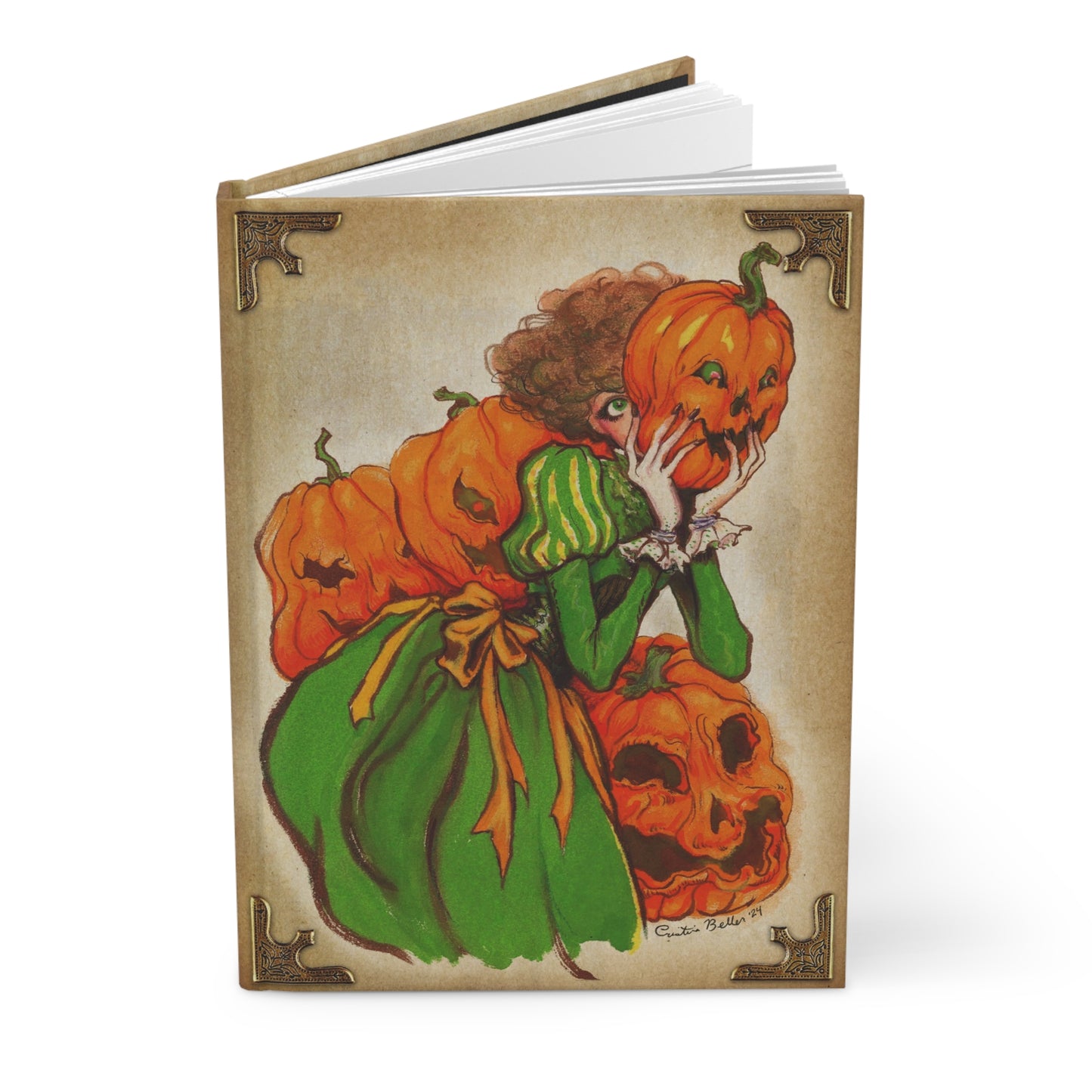 This hardcover journal features a print of the Illustration "Pumpkin Mask" by Cristina Beller. The journal measures 5.75"x8" inches, with 150 lined pages, and has a matte laminate coating.