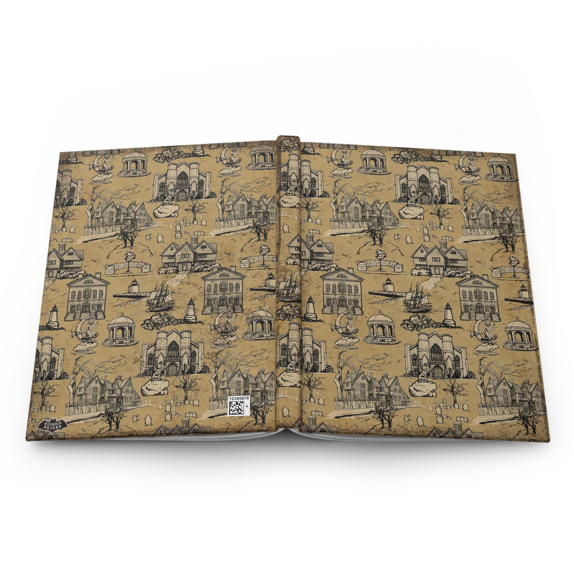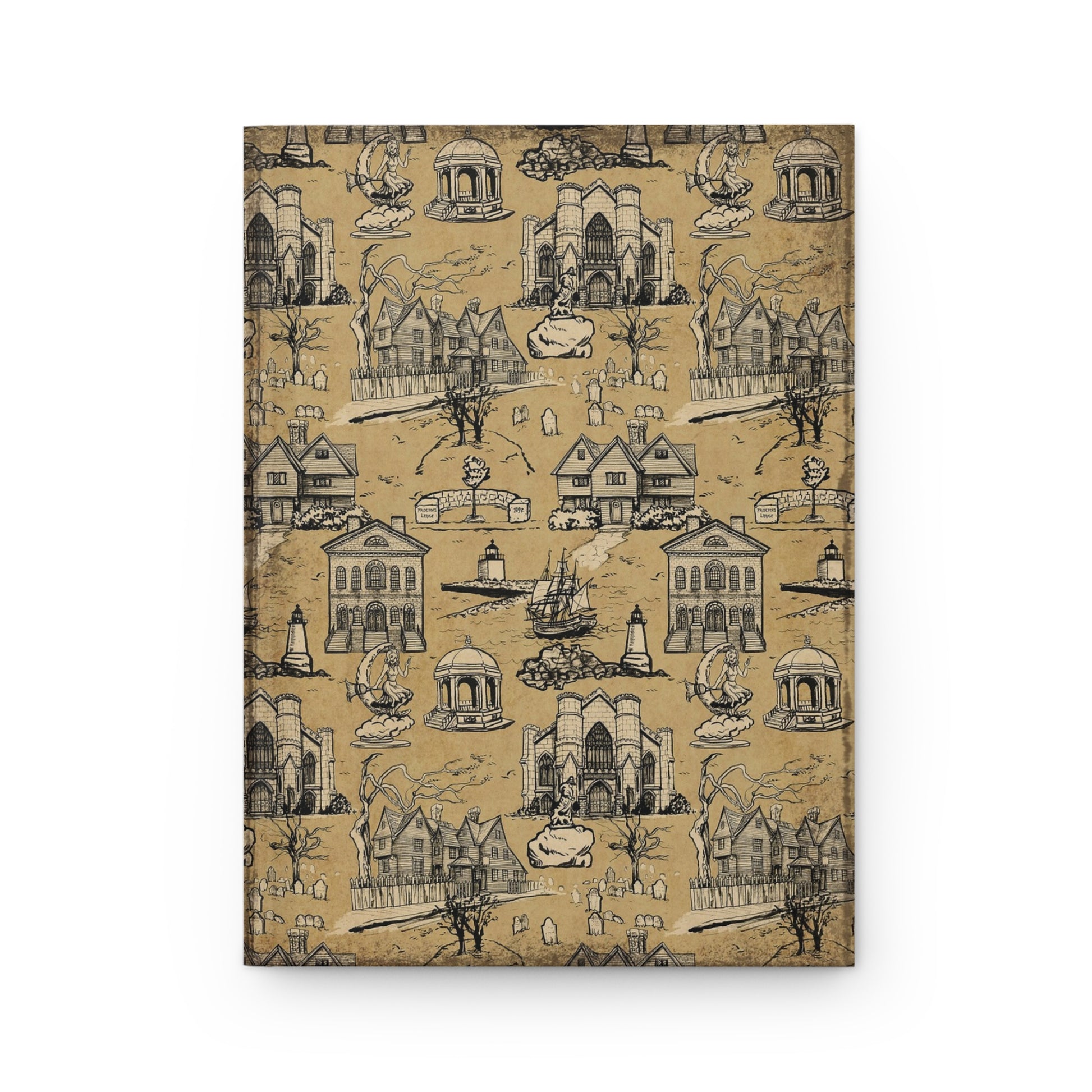 This hardcover journal features a pattern created from original illustrations of landmarks in Salem Massachusetts, by Cristina Beller. The journal measures 5.75"x8" inches, with 150 lined pages, and has a matte laminate coating.
