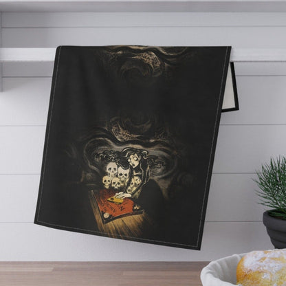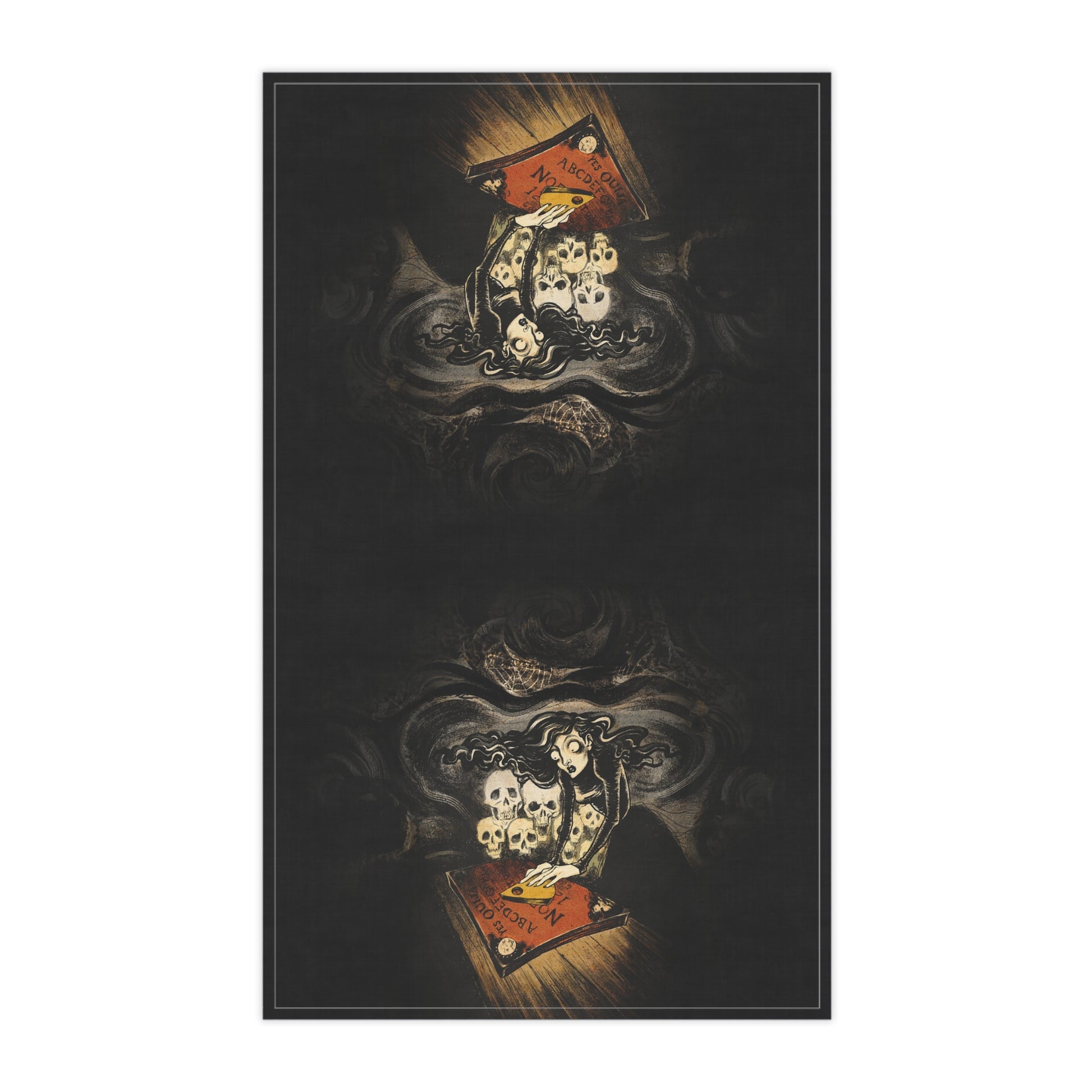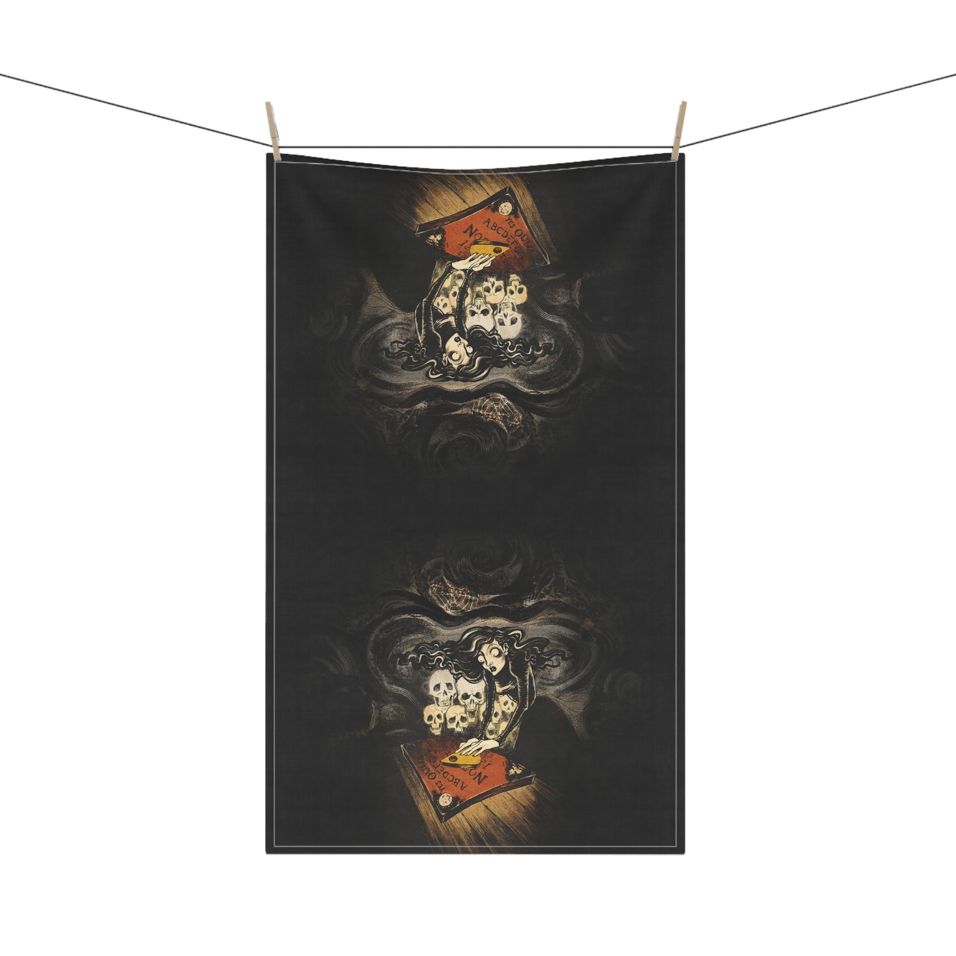 Here is a tea towel featuring the original art "Séance" by Cristina Beller. It is printed on cotton twill and the finished towel measures 18x30 inches.