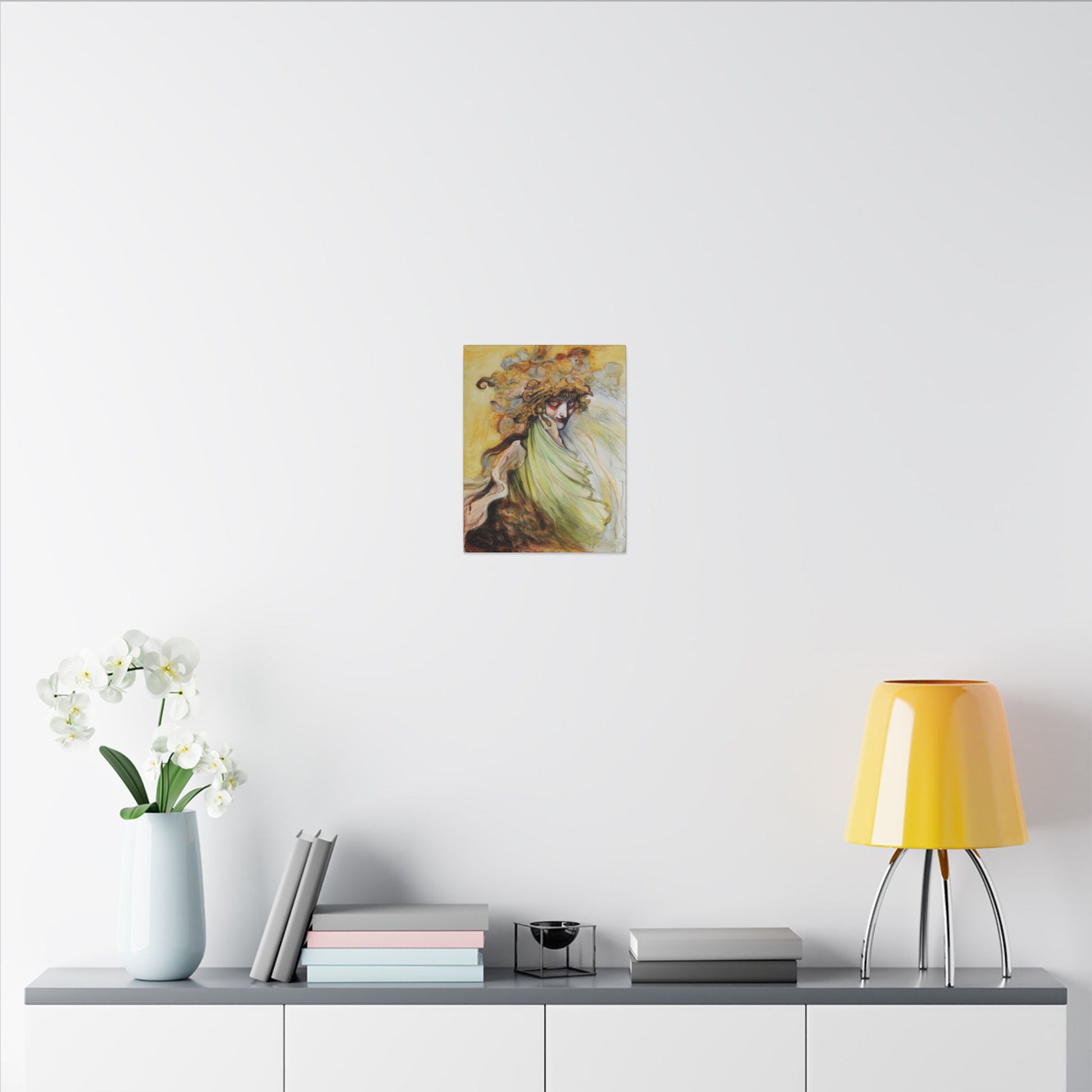 This matte canvas print features the Original Acrylic and Mica Painting "Seer of The Golden Sea" by Cristina Beller. Each matte canvas comes with back hanging already included for convenient placement. The frame is made with profile radial pine that is ethically sourced from renewable forests.