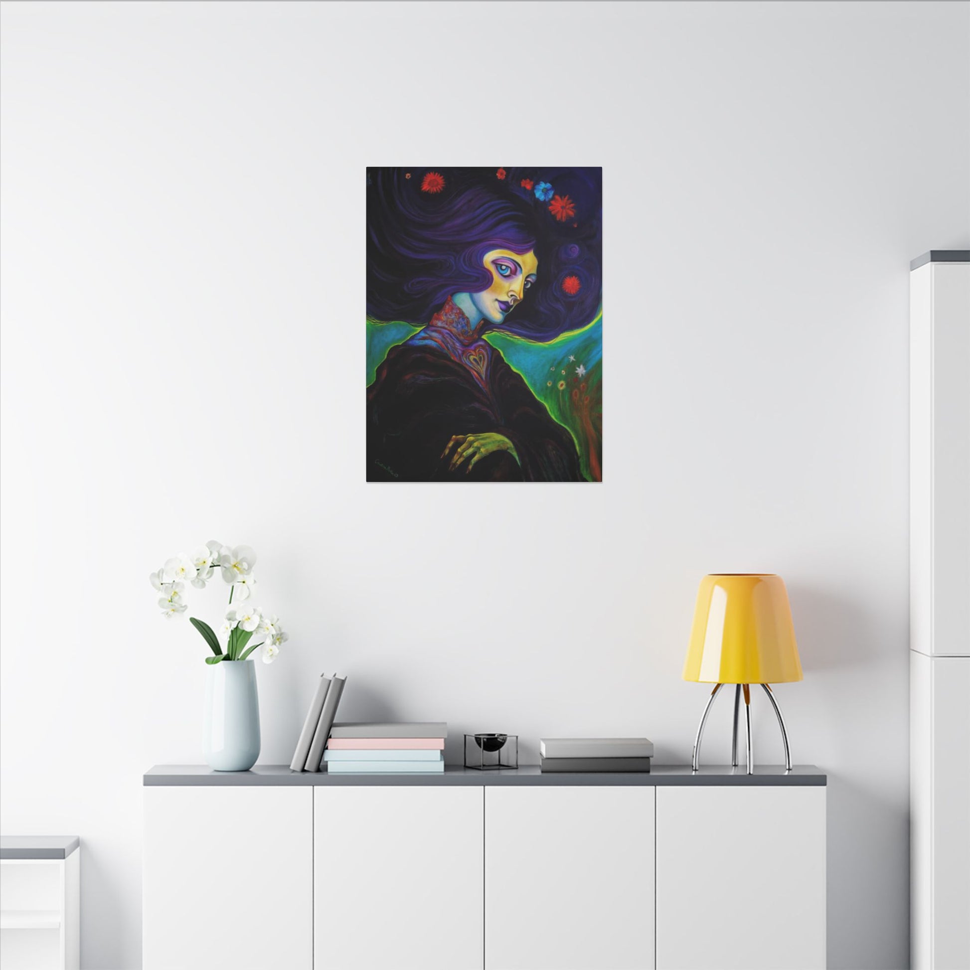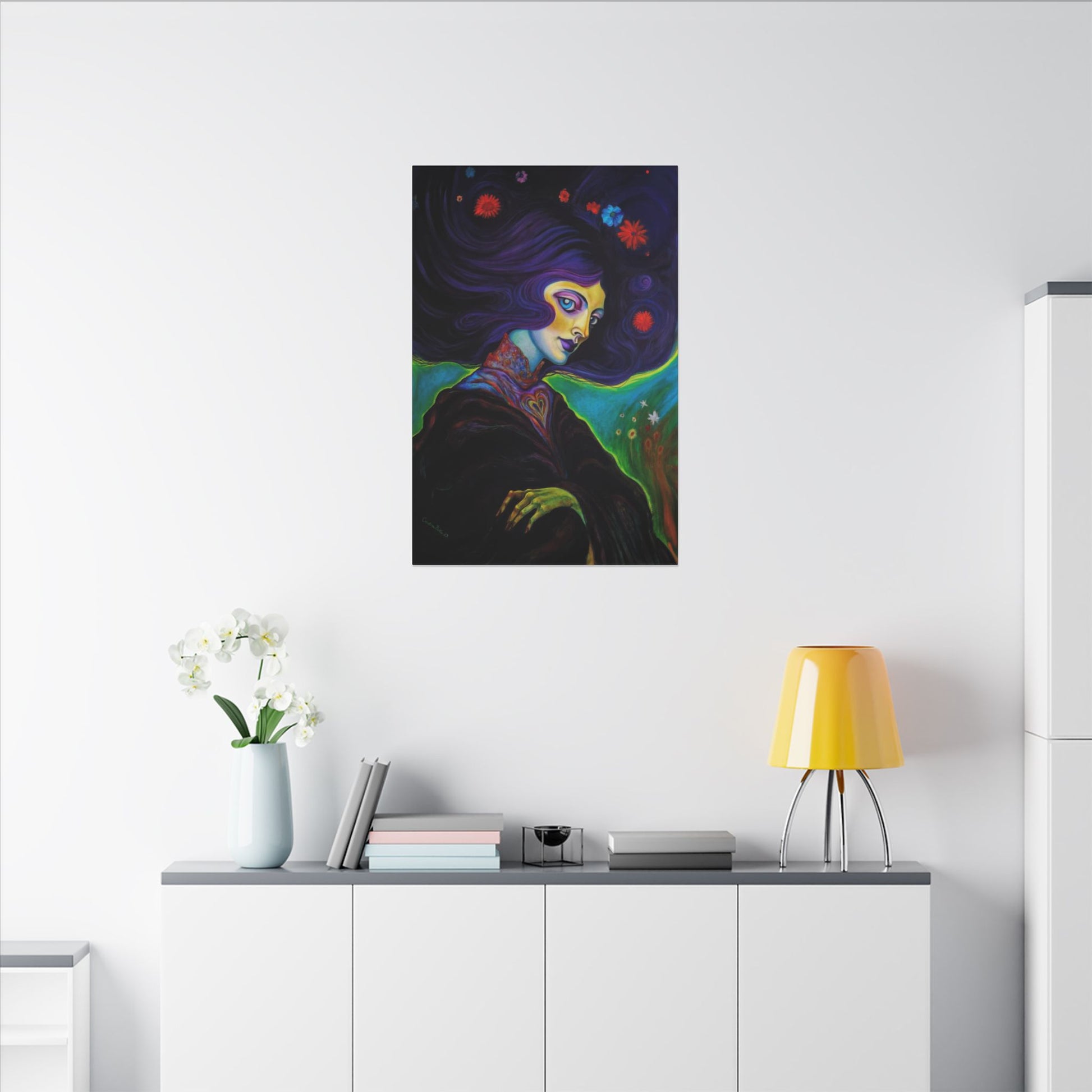 This matte canvas print features the Original Acrylic Painting "Violet" by Cristina Beller. Each matte canvas comes with back hanging already included for convenient placement. The frame is made with profile radial pine that is ethically sourced from renewable forests.